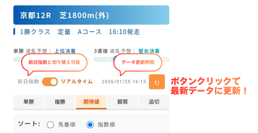 オッズや馬場状態、馬体重等の当日情報を反映し、リアルタイムで変化する指数です。