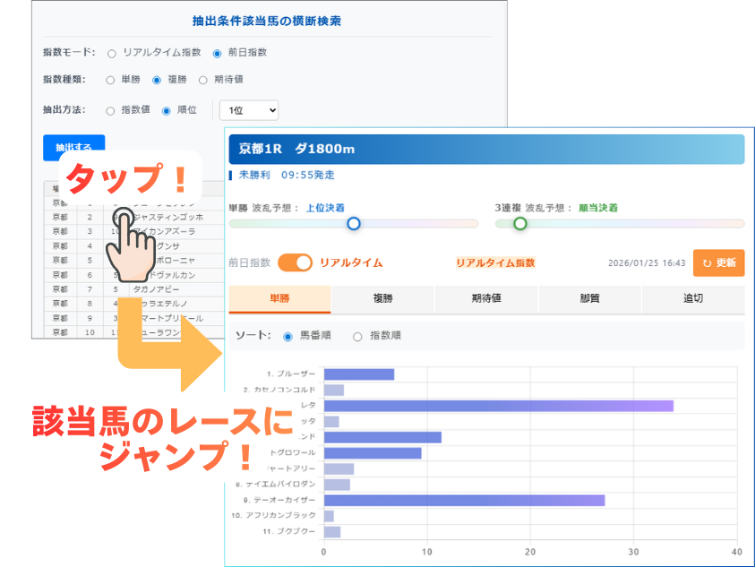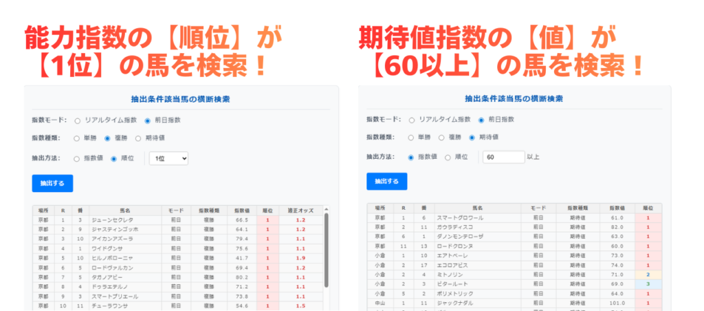 全レースを対象に、指数の「順位」や「指定の値以上」の馬を抽出できる機能です。